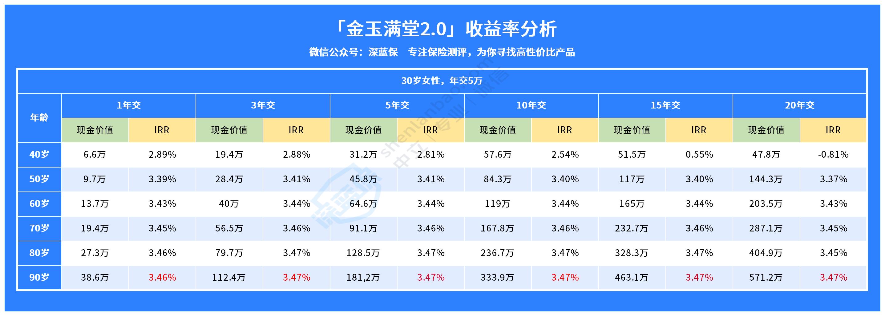 从图中可以看出,金玉满堂2.0后期的收益都会保持在3.46%以上,这个收益在如今的增额终身寿险市场当中,已经可以稳居第一梯队了。