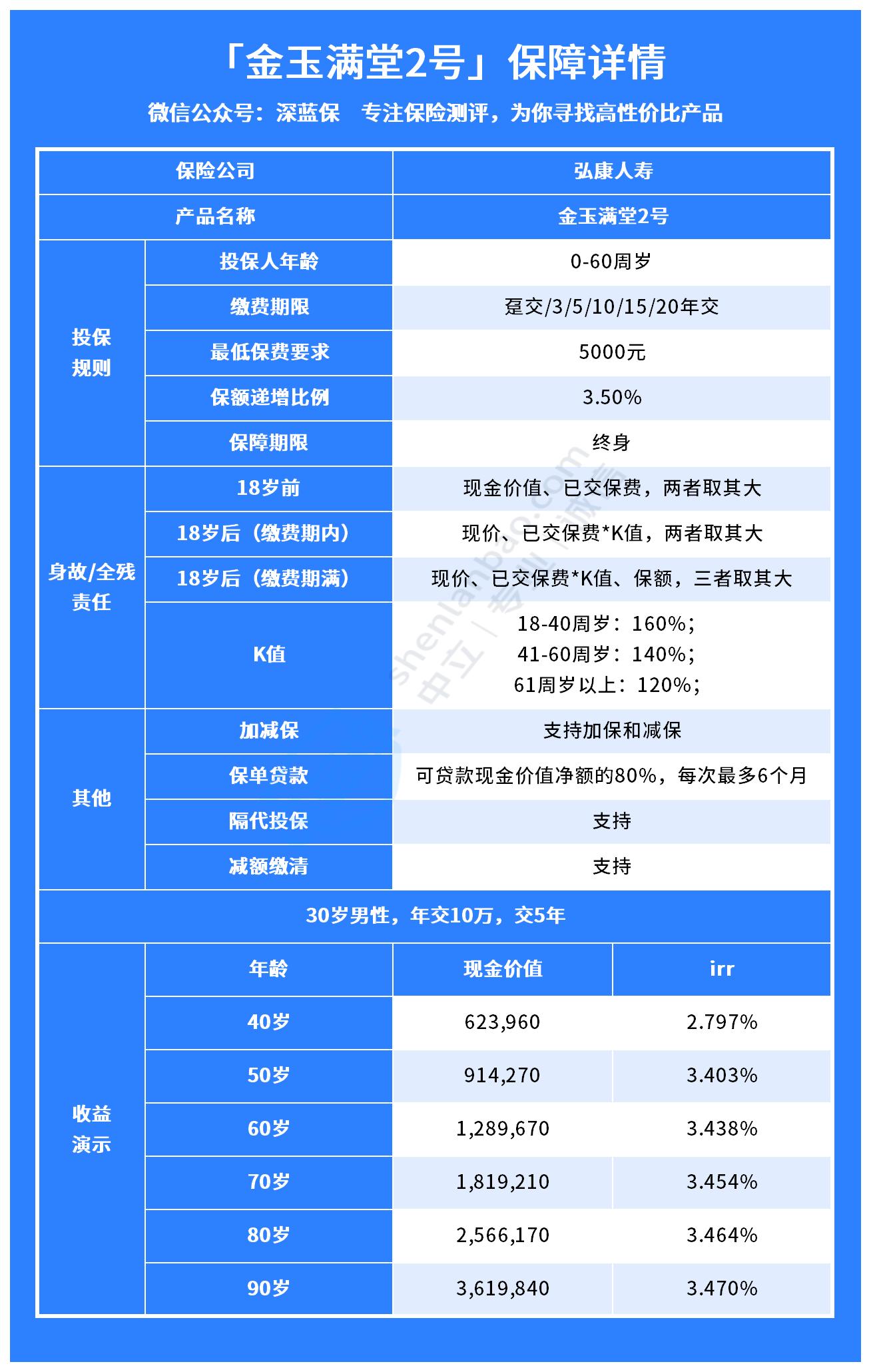 金玉满堂2.0依旧由弘康人寿承保,长期收益率能达到3.47%,收益表现不错,在同类产品中也很突出。