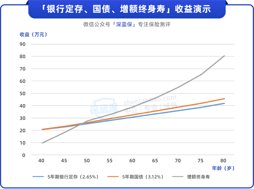 可以看到,虽然银行定存、国债 7 年内都比增额终身寿有优势;但从第 8 年开始,增额终身寿的收益就超过了银行定存与国债,且时间越长,三类产品的收益差距就越大。