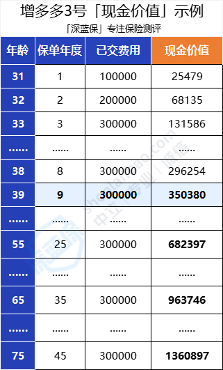 我们还是以“30岁小张买增多多3号,每年交10万,共交3年”为例,来看看现金价值: