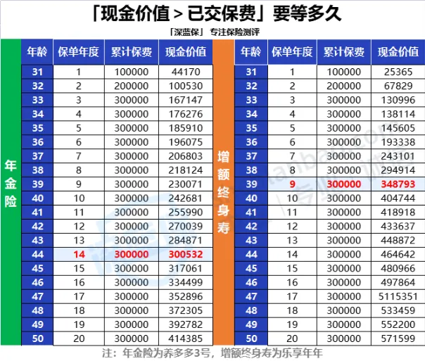 其中年金险(养多多3号)要等14年,增额终身寿(乐享年年)要等9年。