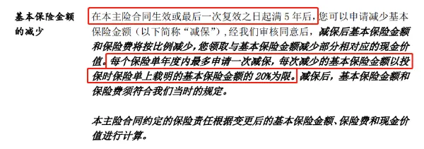 比如长城人寿的平型关增额寿,就规定了投保5年后才能减保、每年只能减保1次、每次减少的保额不得超过投保时基本保额的20%: