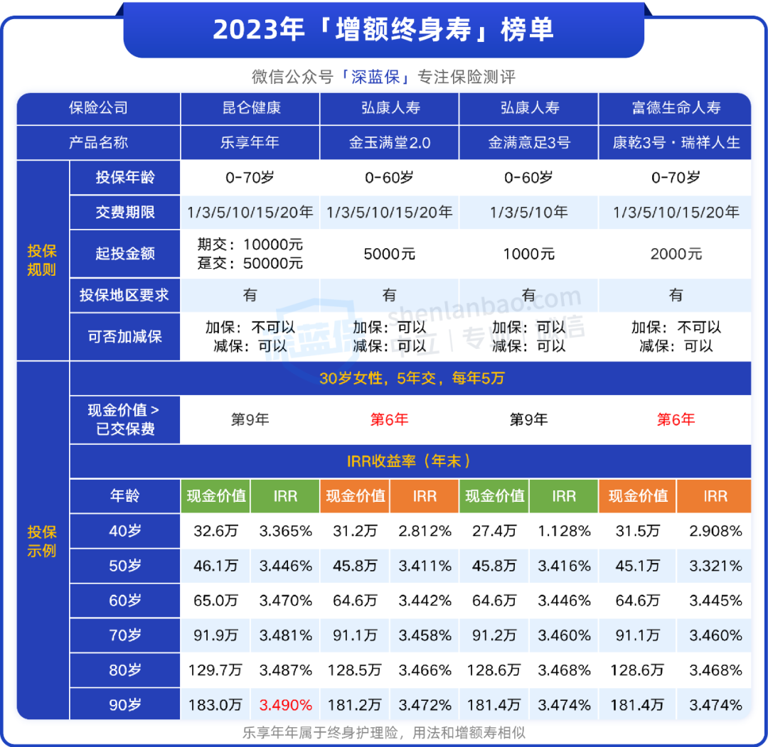 通过对比它们的现金价值,我们就会发现:从 30~60 岁,如果你要用钱的话,基本上都是增额寿的收益更高。