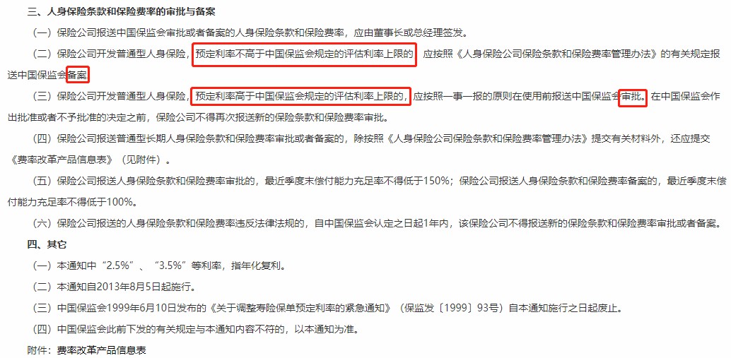 早在 2013 年 8 月,原保监会就规定:预定利率不高于评估利率上限的保险产品,采取备案制;预定利率高于评估利率上限的,则采取审批制。
