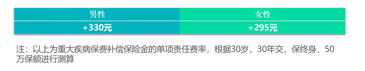 附加上这个【重疾保费补偿保险金】,男性一年只要330元,女性更便宜,只要295元。