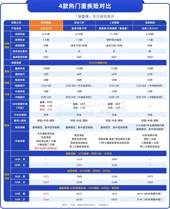 我们挑选了市面上较为热门的,形态比较接近的3款重疾险来进行对比,看看达尔文9号在保障方面的优劣势分别是啥: