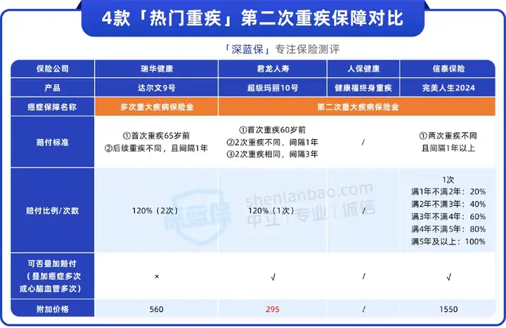 另外,如果想同时附加重疾多次保险金和癌症保障,也建议考虑超级玛丽10号,因为它可以做到叠加赔付。