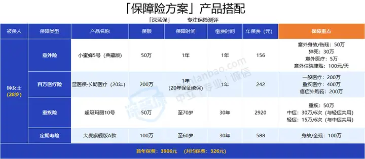 以28岁女性为例,每月只需存下326元,就能搞定成年人必备的4种保障险。