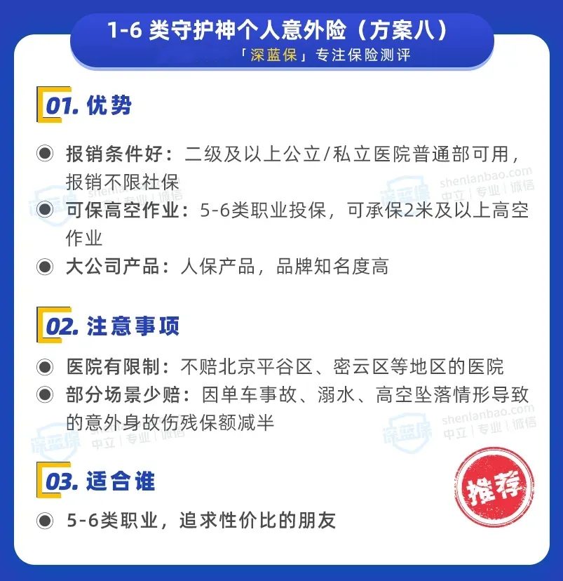 1-6类守护神个人意外险(方案八)由人保财险承保,具体优势和注意事项如下: