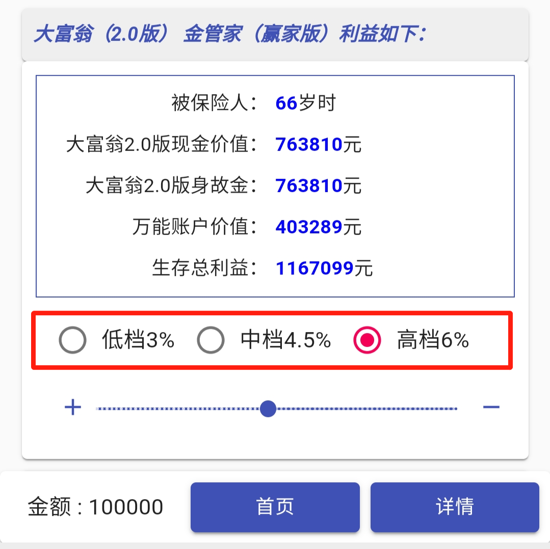 比如说一款万能账户的保证利率是 3%,那我们之后能看到的演示利率就两档:≤3% 和 4%。