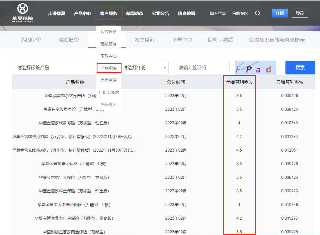以华夏保险为例,我们找到产品利率的公告页面,就可以看到上个月的结算利率: