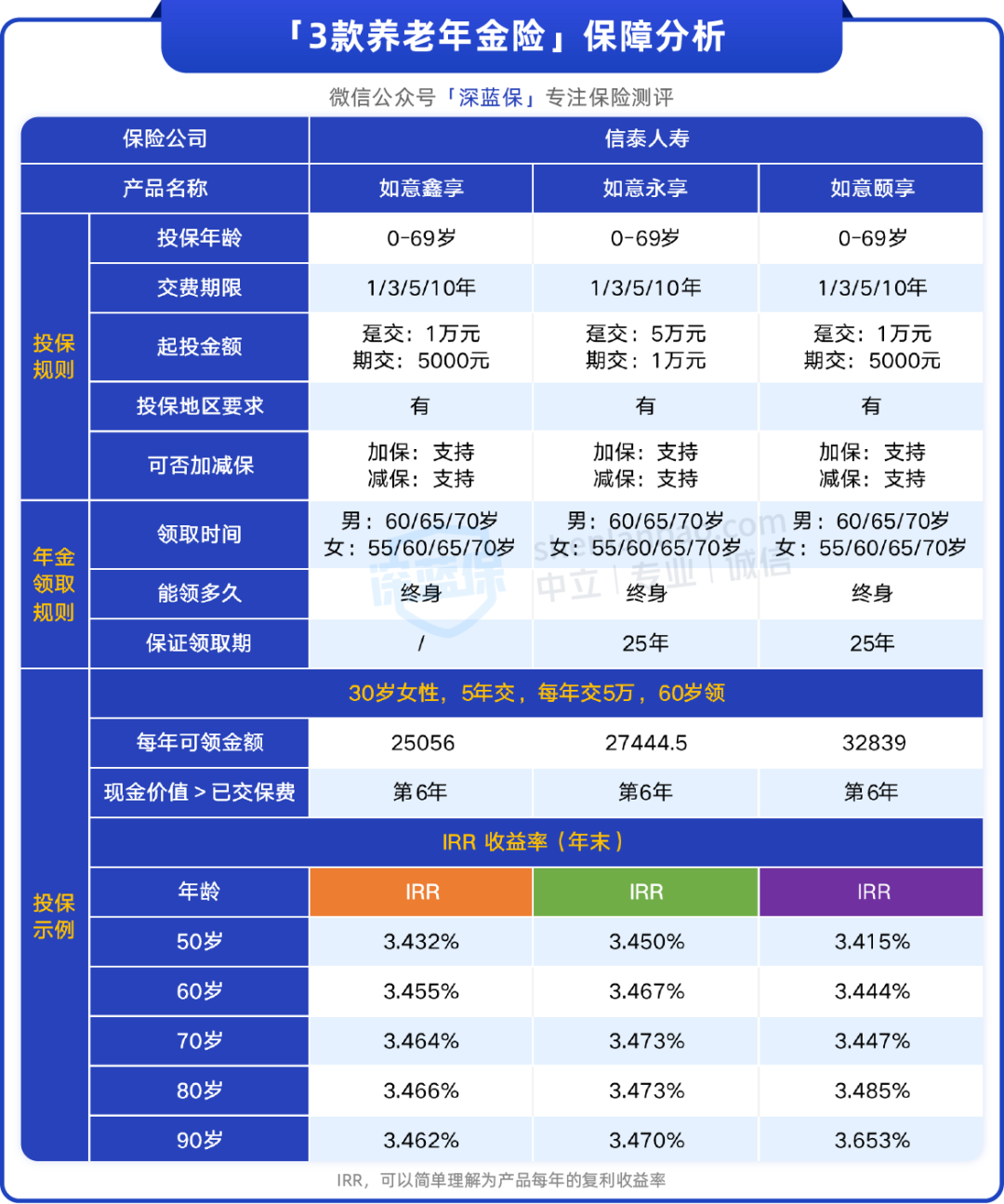 据传,信泰人寿的如意鑫享、如意永享、如意颐享这三款养老年金险,既有养老年金险的终身现金流的优势,也有增额寿高现价的特点,可以规划养老又能让资金稳步增值。