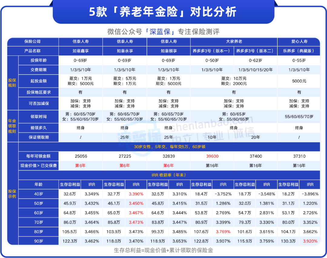 我们挑选了两款热销的养老年金险和这三款产品作对比,一起来看下: