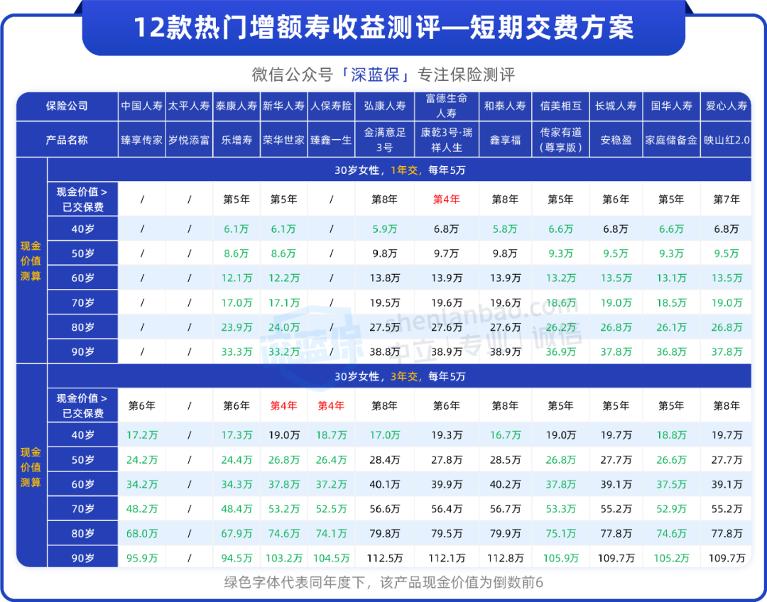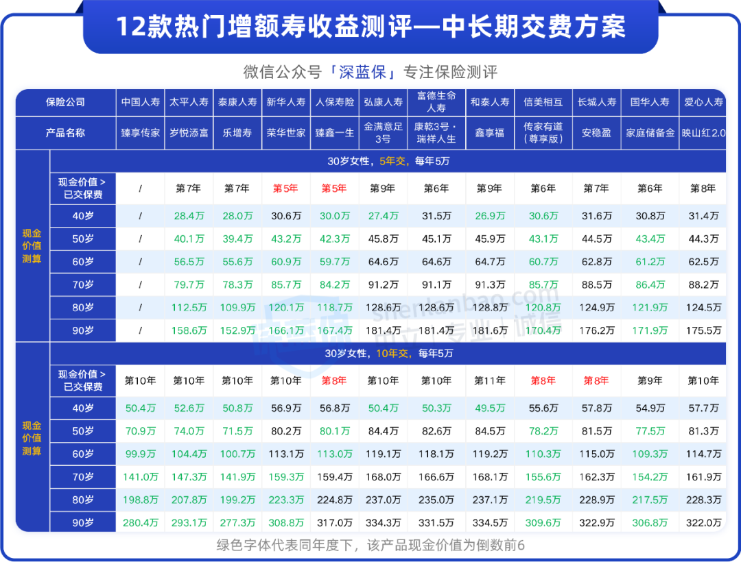 我们测评了 12 款产品在不同交费方案下的现金价值,并用绿色字体标注出了同年度下收益倒数前 6 的产品,如下: