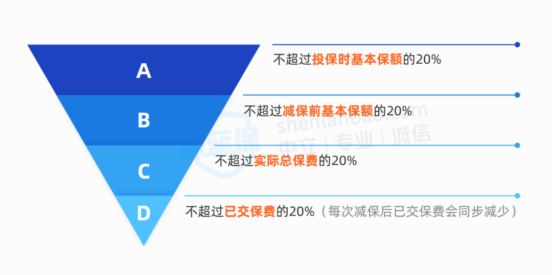 另外还有很少一部分产品没有设置减保上限,只要求减保后现金价值大于某个数值,比如 500 元即可,这种规则很宽松,但一般不写进条款,未来可能会变更。