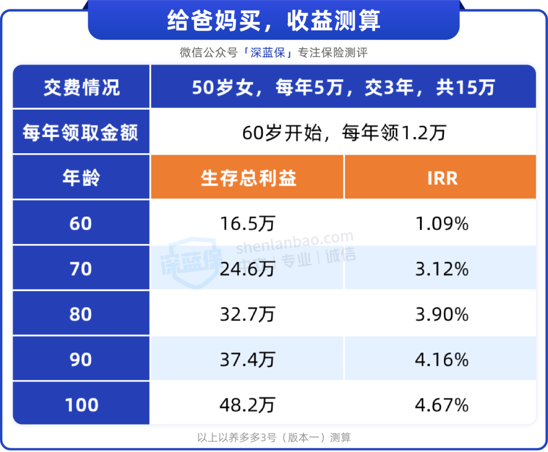 以“50岁女性,3年交,每年交5万”为例,我们测算了养多多3号(版本一)到不同年龄的收益,具体如下: