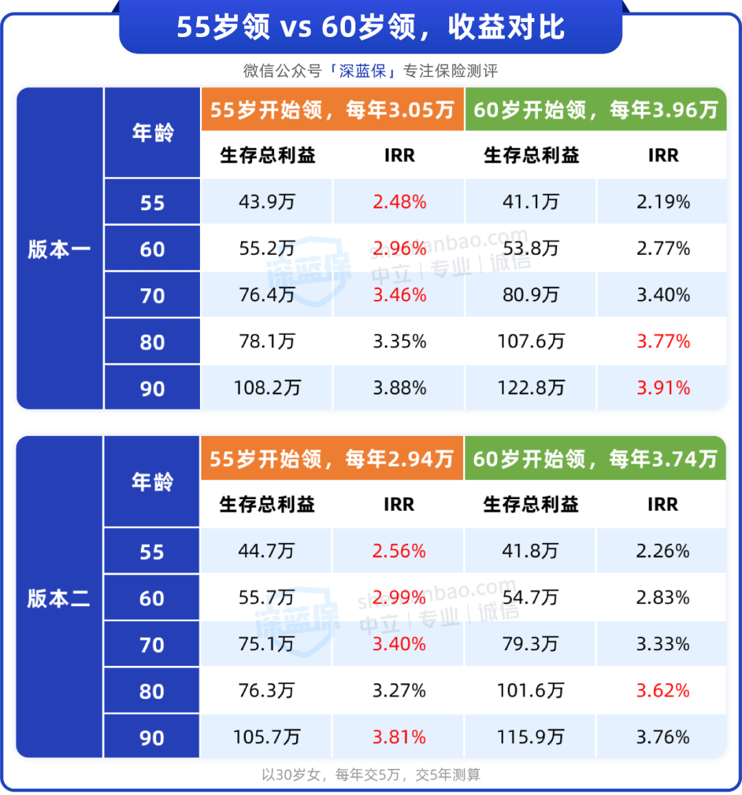 版本一,55岁开始领,每年能领3.05万,60岁开始领则是3.96万,长期收益率也高一点。而版本二,55岁领钱长期收益率会高一点。
