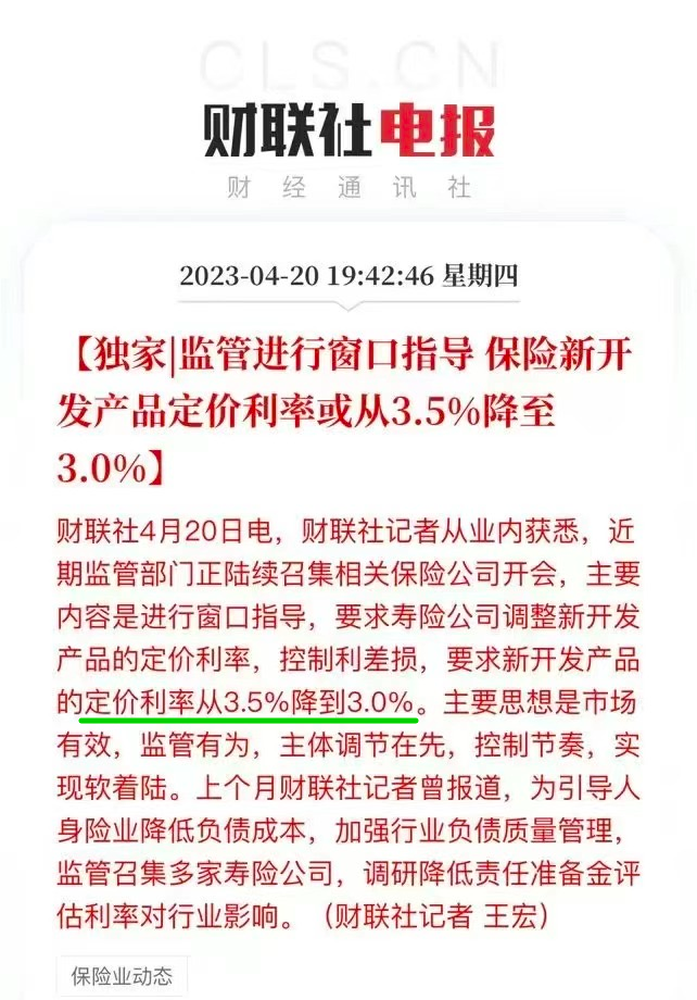 据财联社报道:监管进行窗口指导,要求保险公司新开发的产品,定价利率从 3.5% 降到 3.0%。