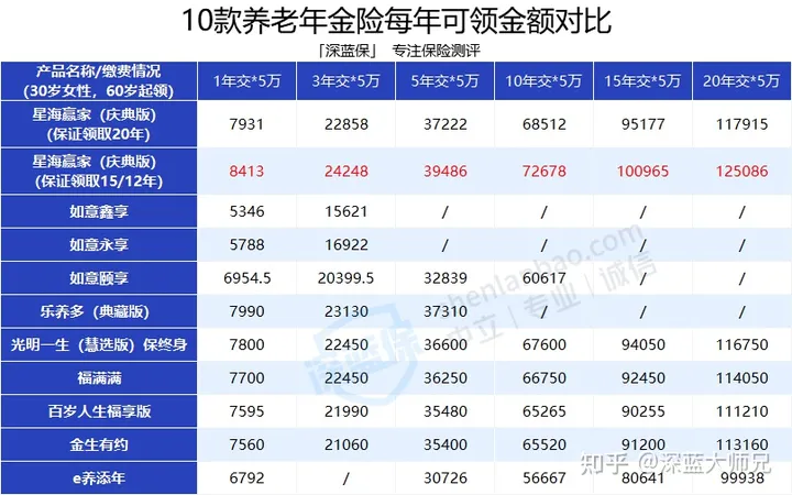 所以深蓝君我,从各位朋友常咨询的养老年金险里,另外挑出了9款产品,来和星海赢家(庆典版)的两个版本作对比分析。