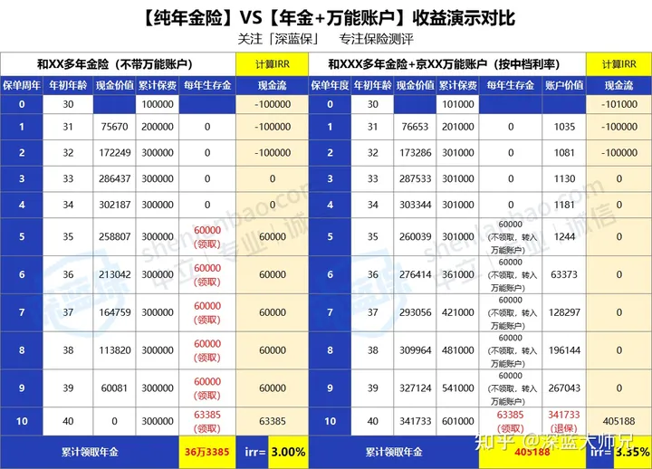 而且万能账户还能帮资金摆脱养老年金险的封闭期,我们急用钱时也能取钱出来。那么这种账户能带来多少额外收益呢?我们以某款年金为例,看下纯年金险和“年金险+带万能账户”两种情况下的收益对比: