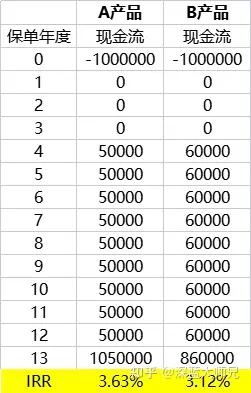 A产品IRR是3.63%,B则为3.12%,谁高谁低一目了然。