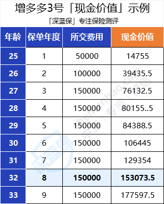 可以看到,到了投保的第8年,现金价值才会超过已交保费;