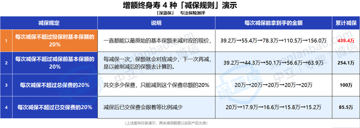 我们总结了目前增额终身寿最常见的4种减保规则,汇总成了一张表格;