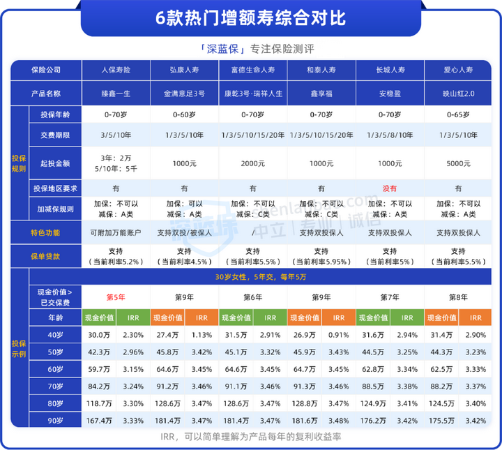 双投/被保人:一份保单可以设置两个投保人或两个被保人,能最大限度延长保单增值的时间。比如夫妻一起做被保人,一方身故后,保单不会失效,能伴随另一方增值终身。万能账户:有的产品附带万能账户,它像一个存钱罐,闲钱能放里面增值,但增值的利率也分保证的和浮动的,建议选择保证利率高的产品,目前较好的是 3%。我们也整理了这些产品的投保规则、特色功能,对比如下: