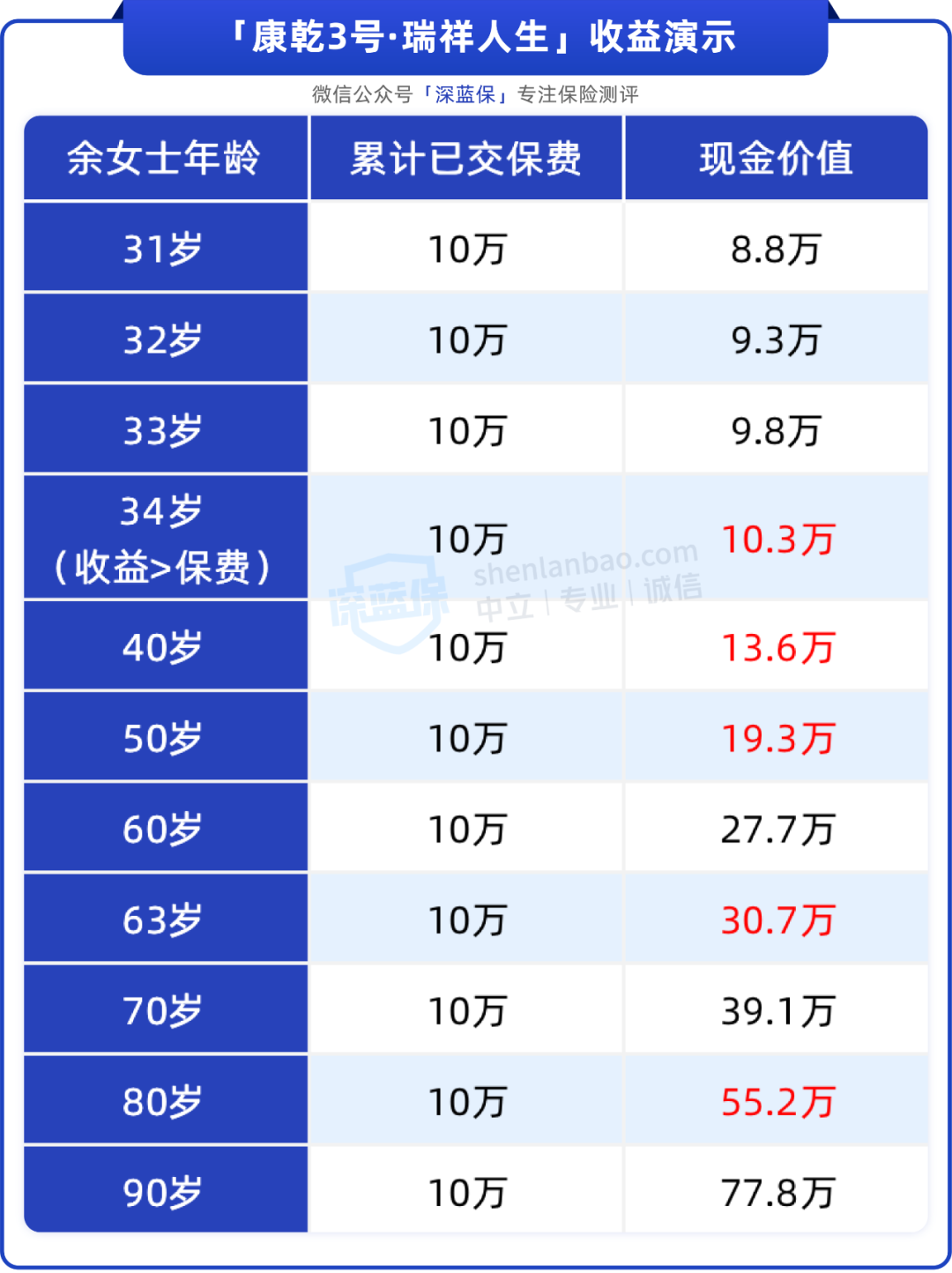 可以看到,在余女士 34 岁那年,保单的现金价值就已经超过她投入的保费了。不过此时收益还不算高,如果不急用的话,尽量不要领取,让钱继续在保单中增值。