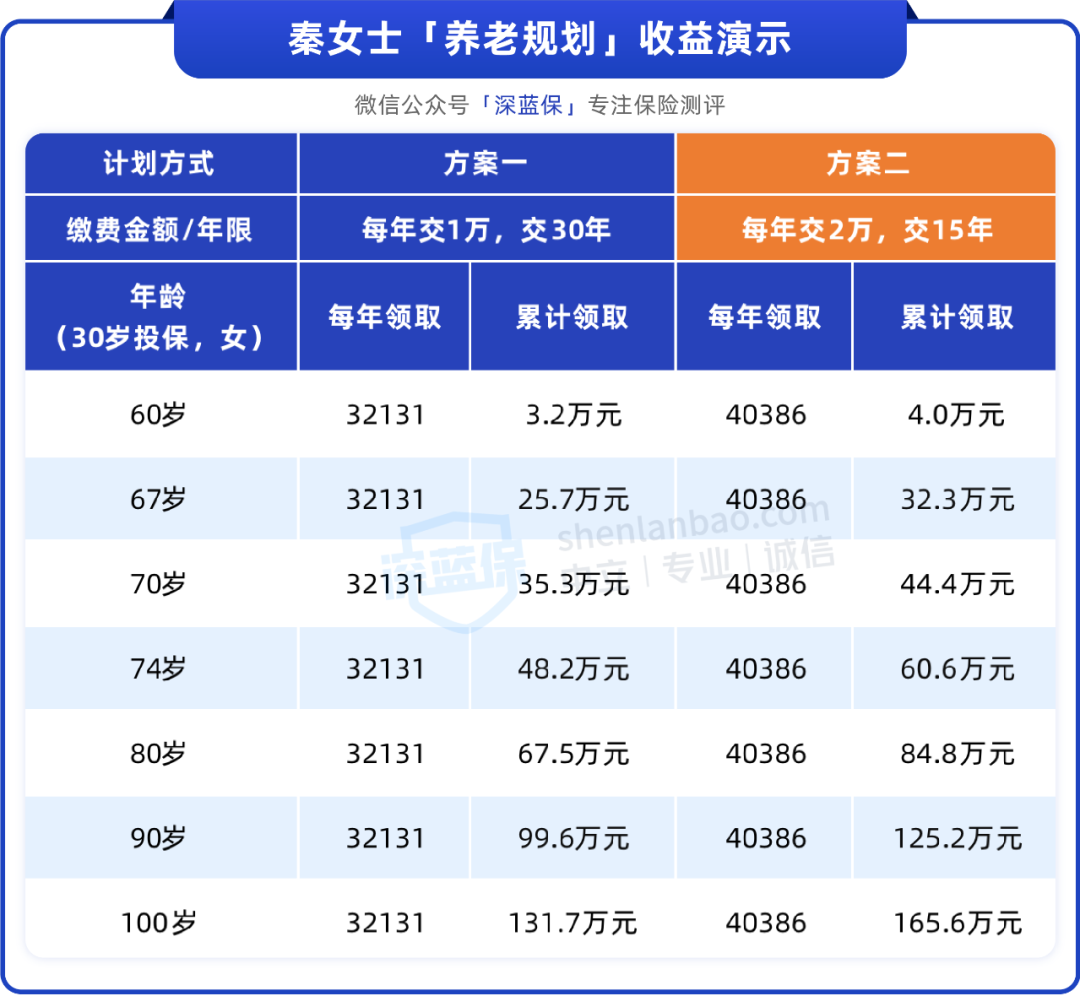 计划一:每年交1万压力会小很多,平均每个月才800多元,以后每年可以领取3.2万元。计划二:每年可以领4万,如果资金条件允许,更推荐每年交2万,15年交完保费,这样领取的养老金会高很多。最终秦女士选择了收益更高的方案二,每年交2万,每个月不到1700元,这不会给她带来压力。