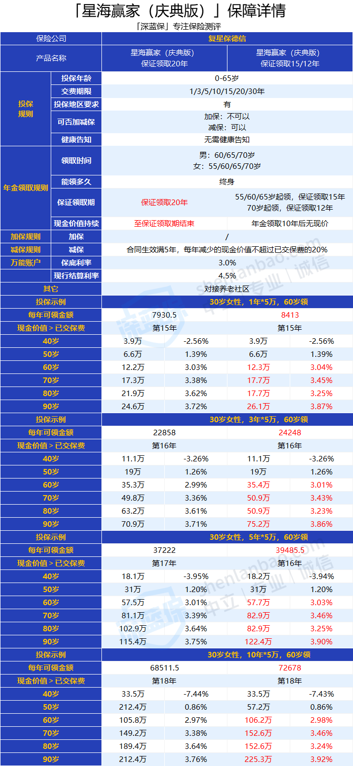 星海赢家(庆典版)按照保证领取期分为,保证领取20年和保证领取15/12年版本。