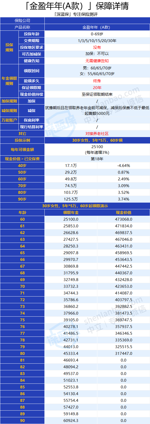 这里我找到了全国可投保,而且每年领取金额按3%递增的金盈年年(A款)做例子: