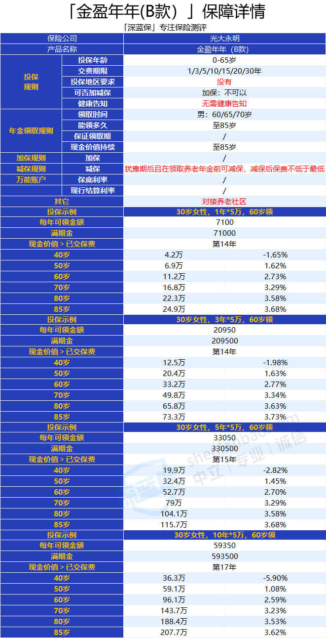 保至85岁的金盈年年(B款),就是一款很不错的保定期的产品。它没有投保地区要求、没有健康告知,满期金是每年可领取金额的10倍: