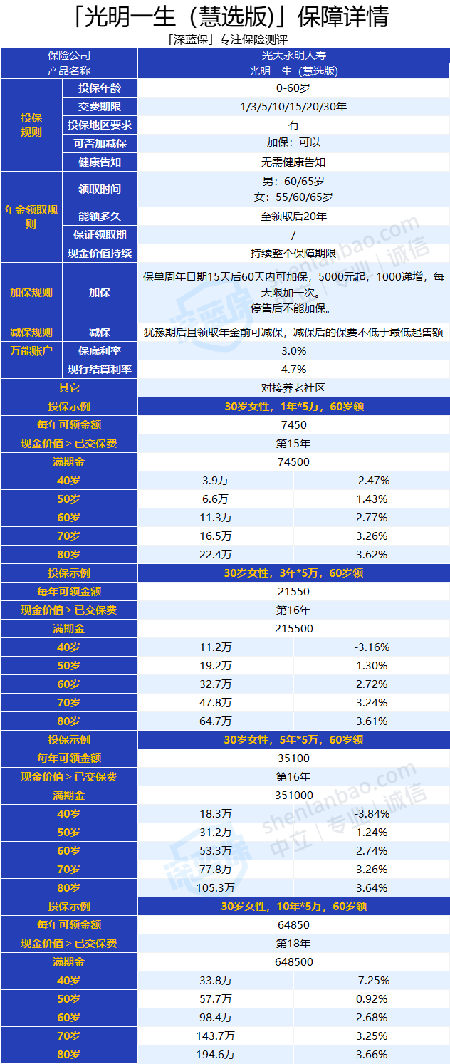 我也从大家最经常问的产品里,找到了保定期、主险收益有3.6%、万能账户结算利率高的光明一生(慧选版)的保至领取后20年版,为大家做介绍: