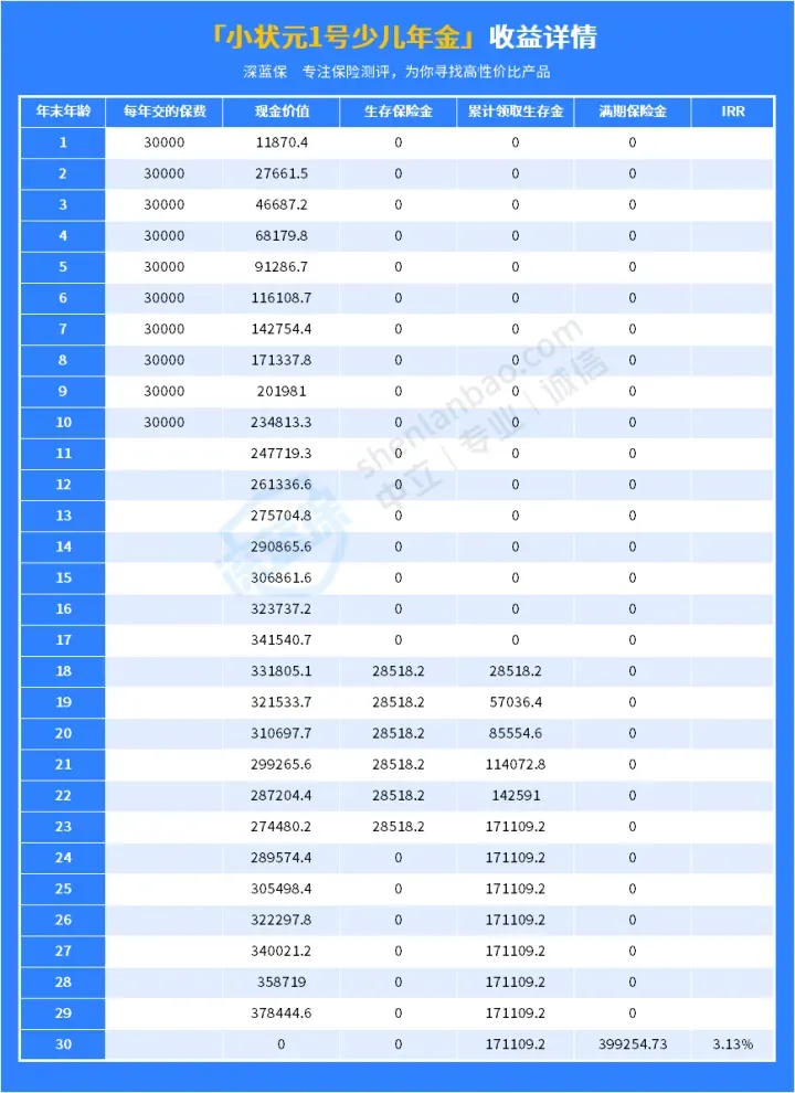 深蓝君以“以0岁男孩,每年交3万,交10年,选择保障30岁版本”为例来带大家看看收益情况:
