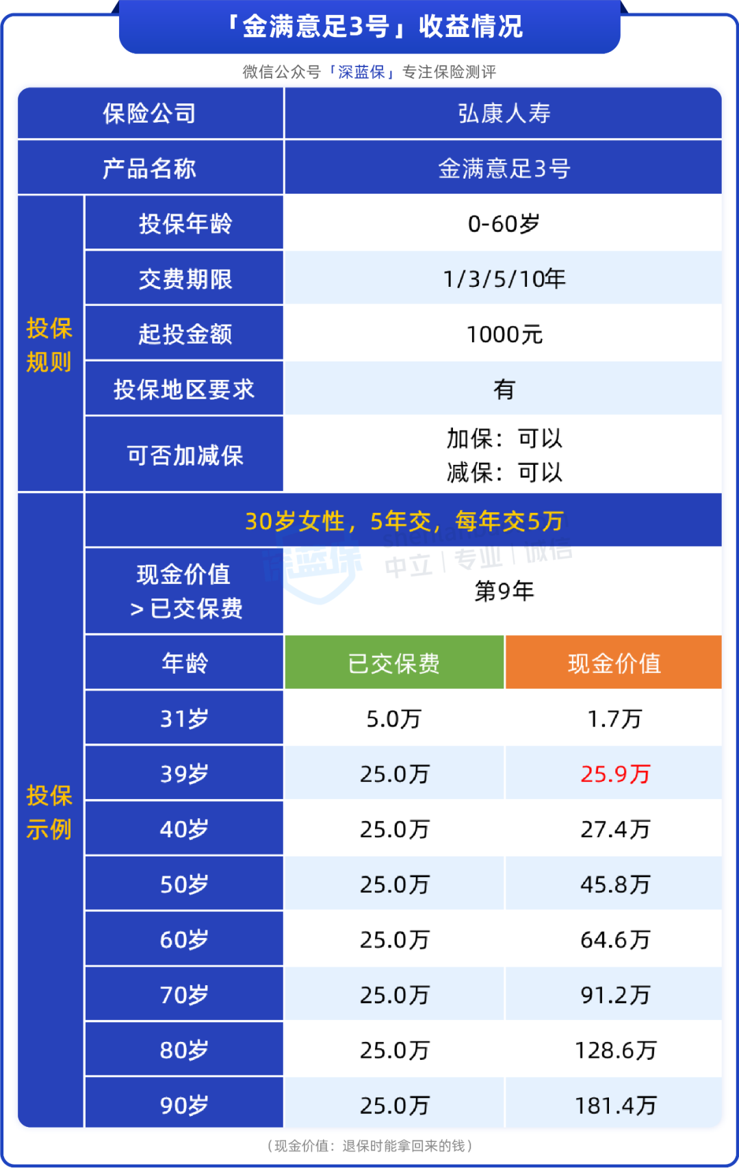 39岁:保单里的现金价值为25.9万,已超过了所交保费25万。60岁:现金价值达到了64.6万,是所交保费的2.6倍。80岁:现金价值高达128.5万,是所交保费的5.1倍。这里需要提醒大家,如果在现金价值还没超过已交保费前退保,会有损失。所以建议各位朋友要使用长期不动的钱来投保这类产品。