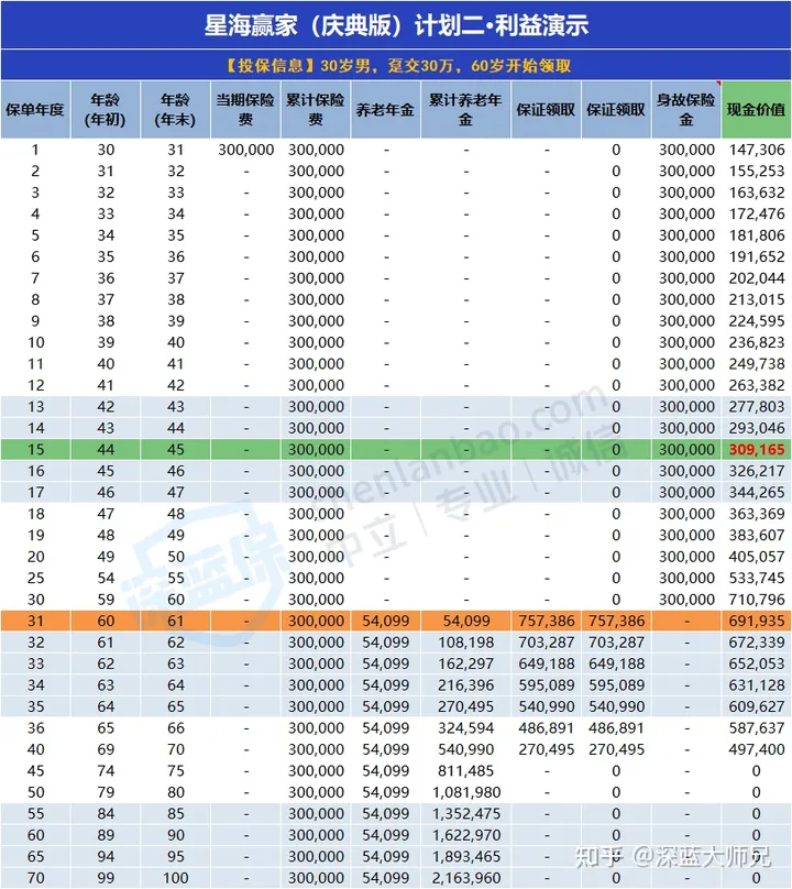 可以看到,30岁交完保费后,要经过 15 年,保单的现金价值才能大于所交保费,如果在15年之前急用钱需要退保,那损失也是肉眼可见的。
