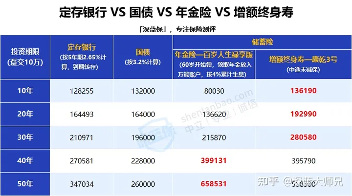 目前为止,具有刚兑属性的投资产品,主要有 3 种:“50万以内的银行存款、国债、储蓄险”,通过对比,如果是想规划中长期理财,那储蓄险会更占优势: