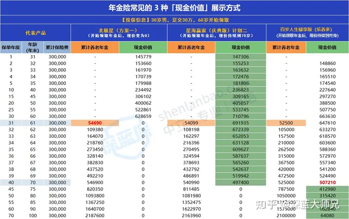 因为买年金险,我们都是在固定的年龄段开始领钱,所以我们可以重点关注60岁、70岁、80岁、90岁这几个关键年龄段的收益,生存总利益较高的我都用绿块突出显示了。