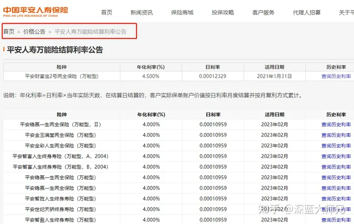 ② 结算利率;结算利率是浮动的,不确定的,目前来看,万能账户的结算利率通常在4%~5%之间摇摆。另外,结算利率一般都能在保险公司的官网上找到,每个月都会公布一次,比如平安的万能险账户: