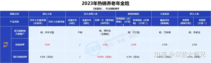 其余产品中,表现比较好的是爱心人寿的百岁人生和光大永明人寿的光明一生,保底利率都为3%,现行结算利率都在4.6%以上,算是比较高的。
