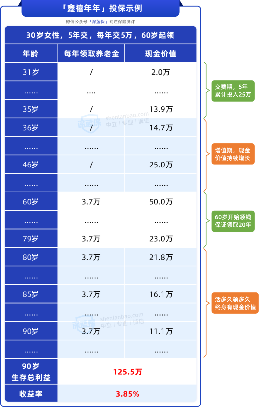 总的来说,「鑫禧年年」是一款不错的养老年金险,收益较高,保证领取20年和终身有现金价值的特点,能给我们满满的安全感。