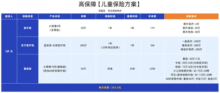 为了预防孩子大病风险,也搭配了一份百万医疗险,5岁孩子购买蓝医保只要三百多,能20年保证续保,十分稳定。