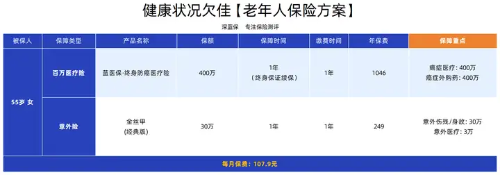 还是以55岁为例,以下方案可供参考,每月仅需107.9元:
