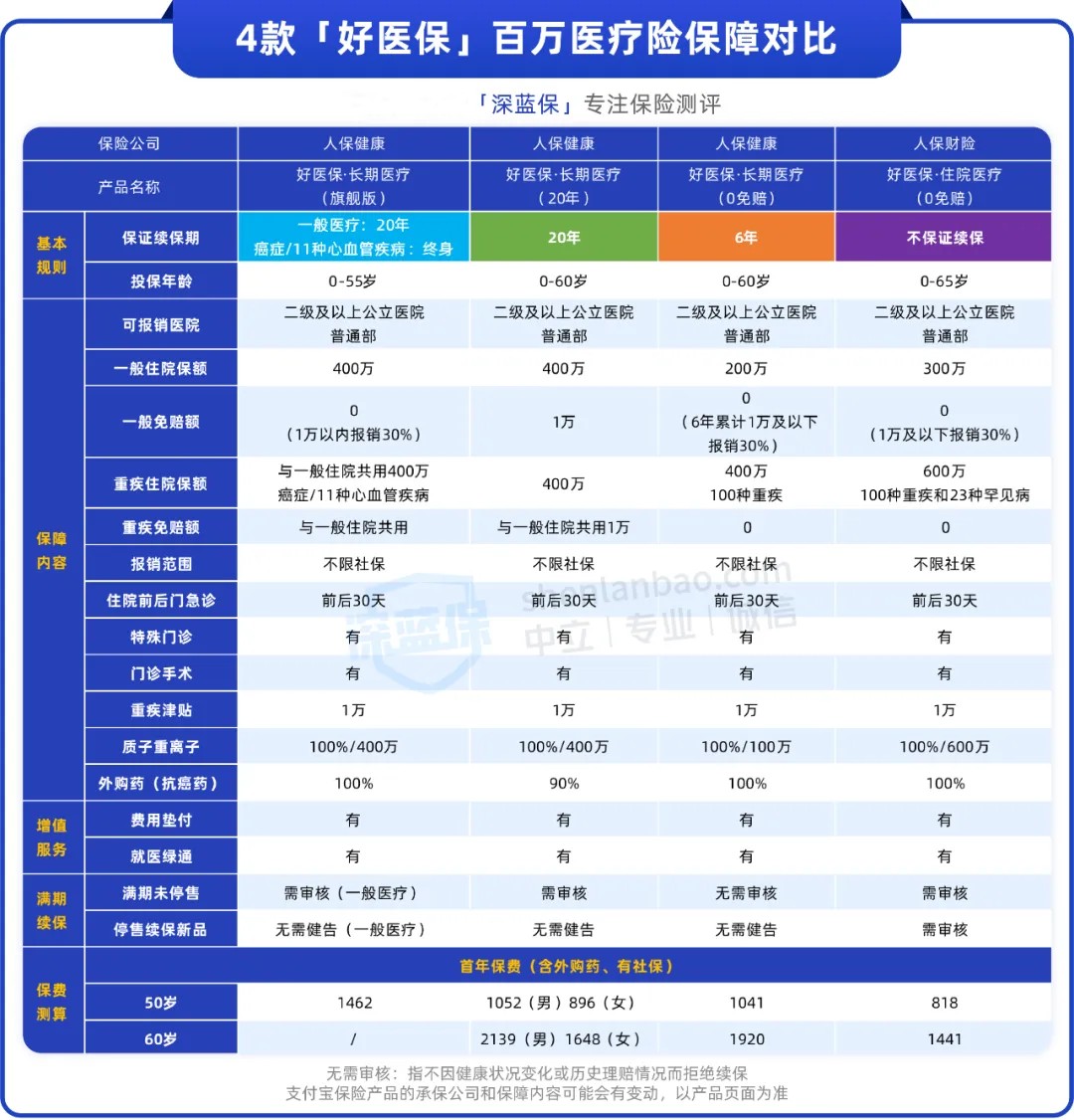 蓝医保长期医疗险保障全面,外购药写进合同,附加后同样能保证续保20年,报销比例是100%,很不错。