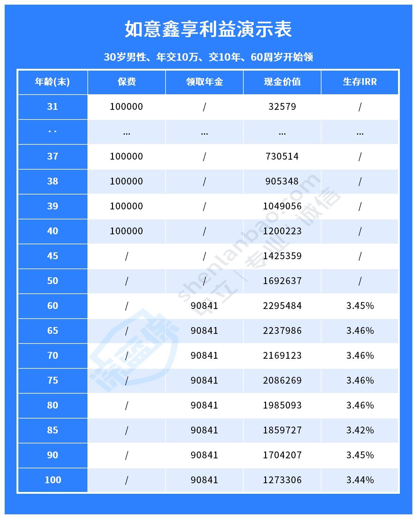 以“30岁男性,年交10万,交10年,60岁领”投保如意鑫享养老年金险为例,